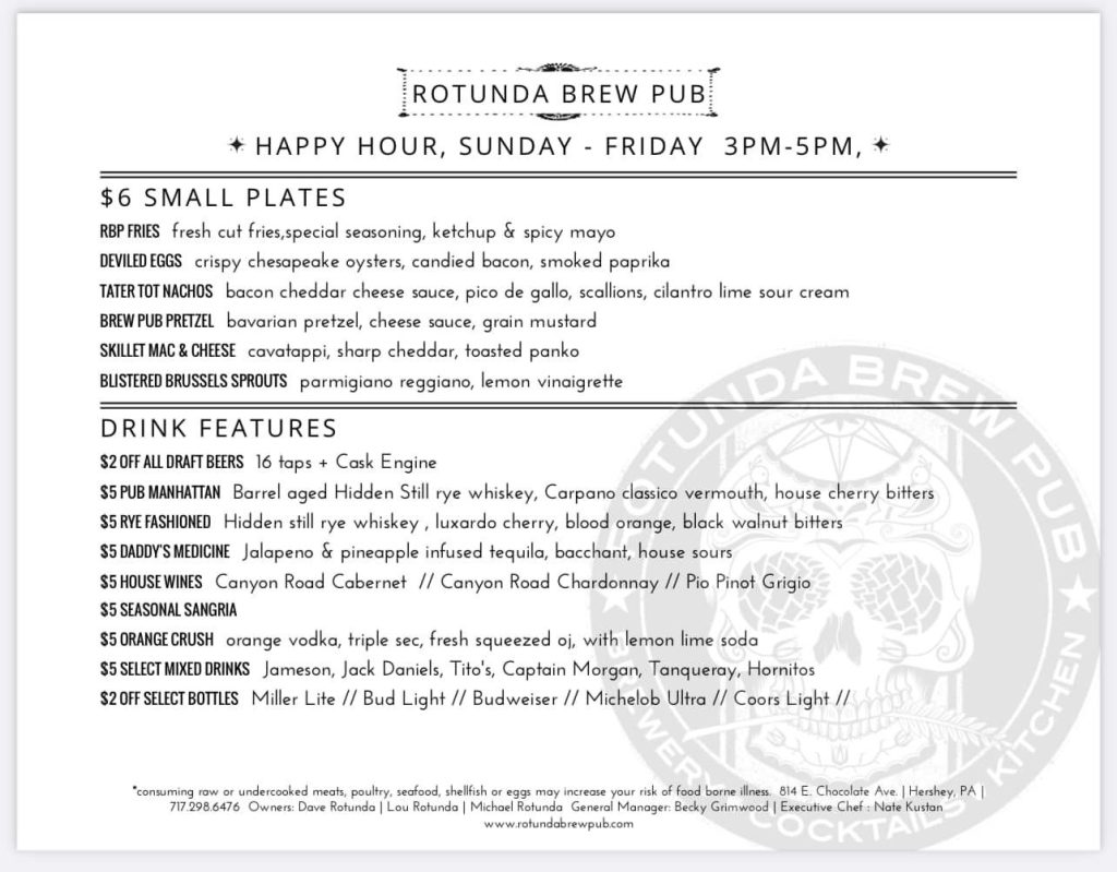 This casual but slightly contemporary Hershey bar and restaurant offers a daily happy hour in their bar area Sunday-Friday from 3-5 p.m. Featuring discounted drinks and appetizers, Rotunda Brew Pub has something for everyone.